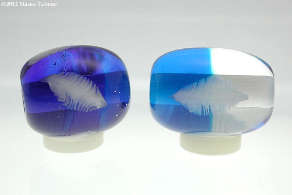 何個失敗したでしょう。そして今日最後につくったのが上の玉です。下層に白糸の流れ、上に羽根をデザインしました。いわば今回のレースの練習の集大成です。羽根は4つ入れていますが、上の写真以外の3つは形がイマイチなのです.....、とほほ。が、今までで一番いい出来の玉であることは確かです。これで一応、羽根の試行を完了とします。いつまでやってもこれ以上、上達しそうにないからなぁ。