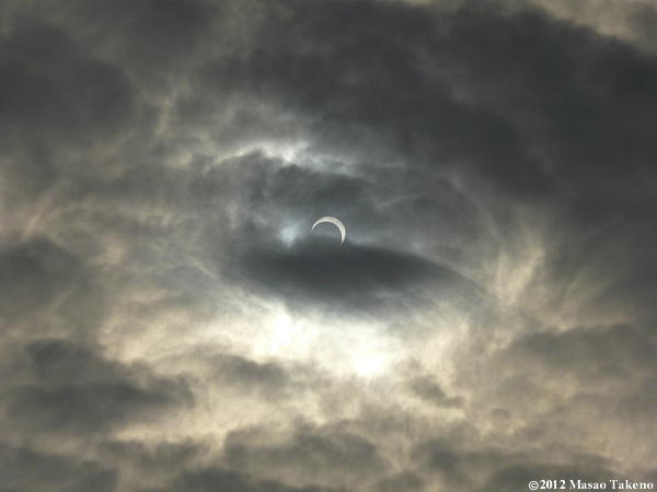 世紀の天体ショー、金環日食。私も自宅で見てたんですが、朝からあいにくの曇り。ただ時々雲が薄くなった時に太陽の形が見えていたので、もしかしたら見られるかもと思っていました。そしていよいよ金環状態に入るという直前、厚い雲がやってきて太陽を覆い隠してしまいました。その前後ではなんとか雲を通して見えていたんですが.....。