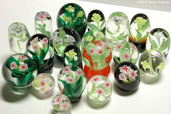 1つの玉に3つの立体花を入れる試行、いろいろ方法を変えたりして試しているんですが、どうにもうまくいきません。1つだけなら花が流れるのは何とか食い止められそうですが、3つともなると前に入れた花がどうしても変形してしまいます。とんぼ玉と違って芯がない分、ガラスが動きやすいのかもしれません。それに花茎を伸ばすとき玉全体のガラスが動こうとして、そのため花びらをさらに変形させてしまいます。