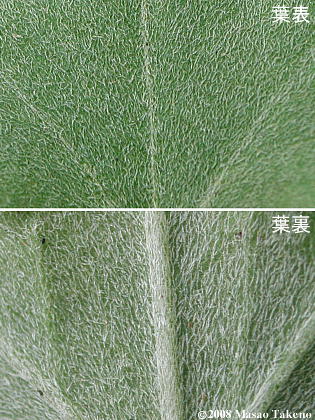 | 茎葉 | 互生、卵形または広卵形でふつう3中裂し、大きな鋸歯がある。 表面は緑色で短毛があり、裏面は密にT字状毛があって灰白色。 |