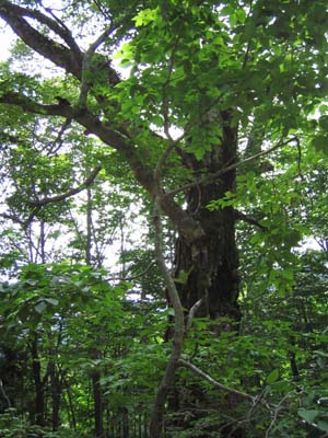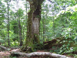 | 駒ヶ岳からまた林道を暫く戻ると「岳岱 自然観察教育林」がある。気軽にブナの自然林を誰でも楽しめるように遊歩道がつくってある。 駐車場もあり、いわゆる観光客も来るようだ。 何と言ってもお目当ては森の巨人『400年ブナ』だが、ほかにも沢山のブナが見られるらしい。 (今になって案内の紙(HPもあり。)を読んだら、なんと入り口近くのブナは「カメの横顔に似ている『ガメラブナ』」と書いてある。あ〜見落としちゃった!残念。) そう言えば、夜叉ヶ池へのルートにも「森の巨人」トチの巨木があったなあ、と思いつつブナを探すと、あれ〜という声。 確かに見事なブナが立っているが、何だか脇に太い幹が折れて倒れている。 これが、400年ブナ? |
