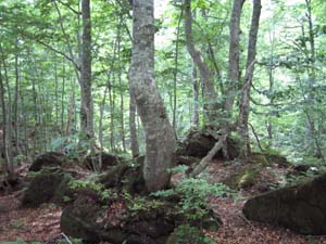 | ちょっと残念が姿に変ってしまったようだ。もっとずっと幹が太くてそれはそれは立派だったそうだ。 しかし、自然のなせるわざ、仕方ないことかもしれない。 教育林の中をそぞろ歩く。何とここにもショウキラン。 ブナの林はショウキランに適した土なのだろうか。土壌の豊かさの象徴なのかもしれない。 細いブナも太いブナも、岩を抱いたブナも、それぞれ個性がある。 静かな森林浴を楽しめる、とても良い場所だ。 杉やヒノキの植林と比べると本当に明るい伸びやかな林でとても嬉しい。 ・・・後はバスに乗り、街中にある世界遺産センターに立ち寄る。 |