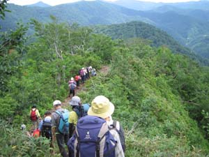 | 立派な展示のある世界遺産センターを見学の後、温泉に向かう。なかなかいいお湯で、長い長い1日の疲れを癒し、宿へ。 この宿は面白いことに、1人部屋が殆どで、しかもベッドの部屋に当たった。狭いながらも必要なものは全部揃っていて、壁は薄くて筒抜けだが居心地のいい宿だ。 そうはいっても、夜行明けで夕食時にはもう体が重くて眠たい。ぼ〜っとする頭のまま食堂へ。 豚カツに甘エビのお刺身、茶碗蒸しに焼き魚、デザートに青いけど甘いパイナップル。・・・もう満腹。とっても良心的で家庭的ないい宿だ。 階段の登り口に大きなぬいぐるみの招き猫があり、通るたびに頭を撫でてみる。 (もっとも I リーダーは"かわいがっているんだよ"といいながら、ホコリが立つほど"叩いて"いたが・・・。) パチンコの景品だったらしい・・・。 明日は早い。林道がまた長い上、東京まで帰らなければならない。 田代岳に続く・・・。 |