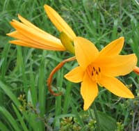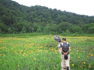 一面のオレンジの洪水。ニッコウキスゲが咲き乱れ、キンコウカがこれから咲こうとしている。 まさに夏のお花畑だ。 |