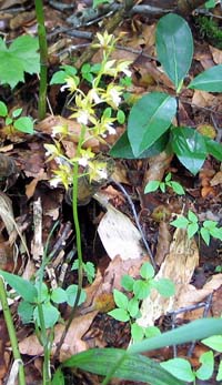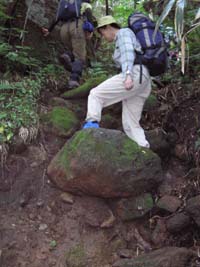| 湿原を離れると、ルートは左折、急に斜度が上がる感じだ。大きな岩がごろごろしていて、結構歩きにくい。 濡れた岩は滑るし、段差が大きいと足が上がらない。 ひと頑張りすると、何とまたショウキランが咲いている。今度はちょうど見ごろのようだ。気をよくして歩いていると更にまたショウキラン! 何という贅沢。 他にはユキザサ、とても大きなマイヅルソウ、ズダヤクシュ・・・花を数えていると尾根コースとの分岐に出る。 標識はしっかり設置してあり、「→駒ヶ岳山頂0.3km、←登山口2.2km」となっている。 |