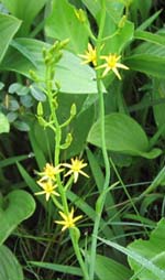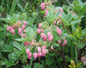 | 他には、もう巨大化してしまったミズバショウの"お化け"と花が終わって首を長く伸ばしたショウジョウバカマ、実をつけているミツガシワが多数ある。早い時期にはこれらが盛りだったはずだ。 湿原にへばりつくように、赤い粘液をつけたうちわのような葉を持つモウセンゴケ。 白いちょっと汚れたホウキのような草は、ワタスゲに似たサギスゲ(鷺スゲ)という名らしい。 それから、薄いピンクのトキソウ、花はまだのコバ・ギボウシ?とウラジロヨウラク、・・・ |