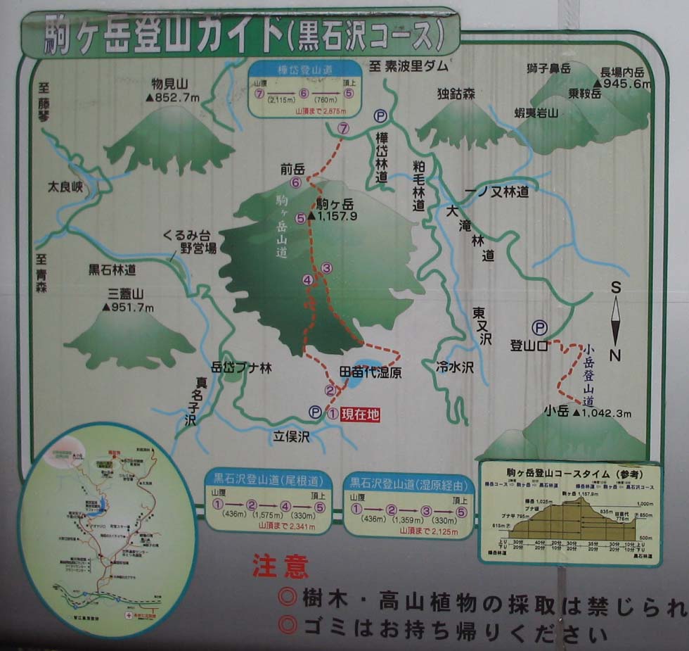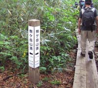 藤里駒ヶ岳:黒石沢登山口8:18〜8:33分岐<湿原経由コース>〜8:34田苗代湿原〜10:23尾根コース分岐〜10:36駒ヶ岳山頂11:02〜分岐<尾根コース>〜12:03分岐〜12:15黒石沢登山口