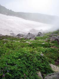 この先はしばしの急登となるが両側はお花畑。ずっと続いているので何とか頑張れる気がする。 みんなは歓声をあげ、記念撮影をしているが、座り込みたくなる。せっかくの展望なのに、立ち上がって周囲を見渡す元気が出ない。これで明日の大縦走が果たせるのか不安で一杯。 |