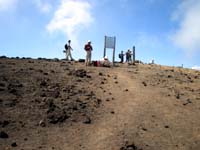 | ようやく登り詰めた山頂でみんなを待つ。 広い山頂からロープウェイ方面を見渡すと、地獄谷と呼ばれる谷間から盛んに噴気が上がっている。生きている山なのだ。 全員揃ったところで記念撮影。これが北海道大遠征最後のピークなのだ。みんな満面の笑み。そう、全員揃って全山無事登頂したのだから。 大展望を惜しみながらも、何とか下山後の温泉タイムを捻出したいのと、フェリー便の出る室蘭までの数時間の移動も控えているため、気ぜわしくなってくる。 ここからの下りもザレていていやな感じだ。尾根を一気に下るコースで、足に来ることは間違いない。 | 地獄谷とロープウェイ駅方面 |