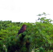 | それは赤黒い、ずんぐりした鳥で、ちょっと目つきが鋭いが、確かに綺麗だ。 Iリーダーは最後の最後に念願の「対面」が叶い、大喜びでカメラを向けているが、マシコは飛び立つ気配もない。 それから再度この目で見て、後続のメンバーがいれば・・・と思うが、残念ながらまだ誰も来ていない。 またね!とギンザンマシコに声をかけて駅舎に向かう。 | 木の上の ギンザンマシコ |