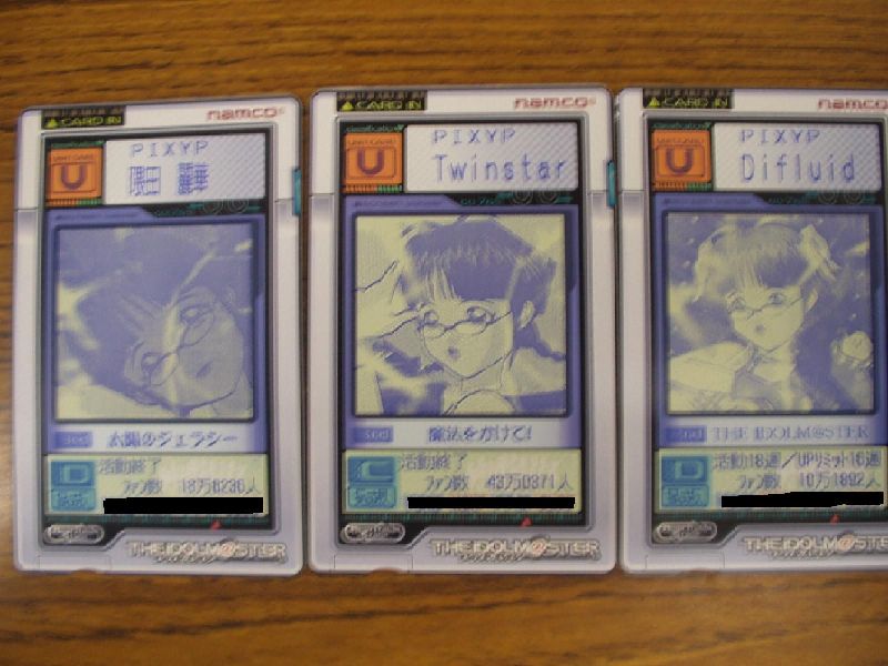 | ■8月15日:暑いね〜 こう暑いとおうちの中はとんでもないことになります。 ということで土日はゲーセンで涼しく過ごしました♪ でもゲーセンでやるゲームって気付くとおんなじようなのしかやってないのに最近気付き・・・・ 今はギターフリークスかアイドルマスターの2択ってところです。 極々稀にbeatmaniaIIDXやるけど・・・・ ギターは全曲解禁出来たので色々と遊んでたらまた国王になっちゃいました(汗) でも今のメインは殆どアイドルマスターになっちゃってます。 過去から今までのユニットカードを何気なく並べてみました。 ![]() 左から順に1枚目(律子さんsolo)、2枚目(律子さん&千早さん)、3枚目(律子さん&あずささん)です。 最初やった時は順調だったのですが途中から負け続いてDランクで活動停止。 2回目からデュオが選べるようになった為、千早さんを入れてみたのですが・・・性格がよくわからない。 朝のあいさつの選択肢場面では常にテンション下がりっぱなし、何を選んでもバッド方面と駄目駄目でした。 そして今回のあずささん。かな〜りほんわかした性格&口調でかなりいい感じです♪ でも写真でわかる通り、カードの絵柄(オーディション最中に撮影した写真が絵柄になる)は・・・・(汗) それにしても何でこんなにアイドルマスターにはまってるんだろ?と過去の記憶を振り返る。 ・・・・・・DEBUT21・・・・・これか!!! 今日の一言:これも1年間の期限付きでアンドロイドを全国アイドルに育てあげるんだよね〜 |