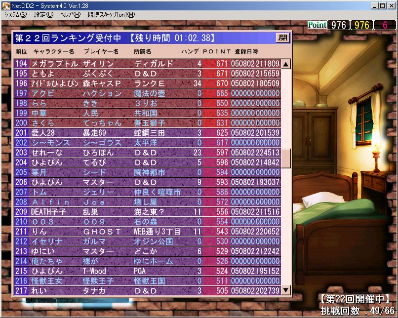 | ■8月4日:もう耐えられない!! 今日は絶対アイドルマスターやる〜〜〜〜〜!!!!! 結局昨日も残業の為にプレイすら出来ませんでした。おうちに帰ってもDD.NET2のランキング 確認して登録したらとっとと寝ちゃいました。お風呂入らなかったのが気持ち悪かったけど・・・ でもやっぱり朝風呂って気持ち良いよね〜♪・・・・そして早朝からメールの添付ファイルを開いて お仕事・・・・・・10時から基板製作開始するためにどうしてもチェックに追われてるんだよね〜。 ・・・・・ワタシノジユウジカンヲカエシテ・・・・ いい加減DD.NET2のお話をしといた方がいいでしょうか? DD.NET2(DUNGEON&DOLLS.NET2)は某ユーザークラブ会員限定のゲームなんです。 しかも遊ぶのに市販の製品+ダウンロードパッチが必要と。(Aの館7) もともとここの会社のゲームは無駄に長く遊べるのが多くてたま〜に買っちゃったりしてるんですが、 今回はたまたま大当たりだったみたいです。でもやっぱり思っちゃうことはえちぃはいらにゃい・・・ ランキングを見てて思うことなんですが、NPCの名前がかなり逝っちゃってるのが多いです。 というかいいの?って感じのが結構多くて・・・・ ![]() (c)ALICESOFT,2005. この水色の名前がNPCです。あ、私の名前はこれには載ってませんからね。 ほかにもこんなのがありますよ。 ユリア ケンシロウ 世紀末 チチ ゴクウ 龍玉 みみー みっきー ですにー国 今日の一言:どこのゲームか伏せてないし・・・ |