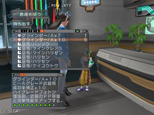 | ■3月1日:風邪で1回休み 昨日は散々でした。 体調が悪くて休みを貰ったら・・・鼻血と嘔吐が同時に発生。 いや、ありえないから。とトイレの側でうずくまってました。 で、落ち着いたところでPSU>ここでもう間違ってる 既にまともな思考もなく、ボーっとなにかやってたような気もしますがよく覚えてません。 ただ写真を撮る事も忘れて呆けた時がありましたが。 雷のアゲハセンバがどこ行っても18%止まりでしか売ってない〜!!仕方ない・・合成してみるか!! と基板2つ買って合成確率55%に挑戦。24%と44%が出来ちゃいました。 おまけにAグラ基材が増えたな〜と5つまとめて合成したら+10が・・・・・・ ついでに・・・・PSUイルミナスの野望で第4惑星がラグオルですか・・・・アル・ラッピー出るかな? 今日の一言:今日からGCPSOオンラインちょくちょく顔出します。 |