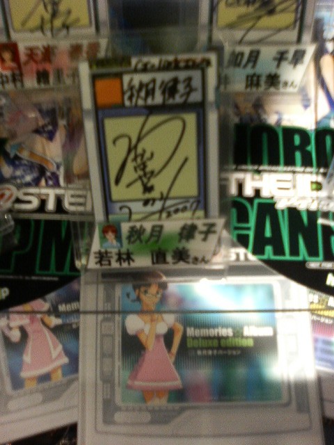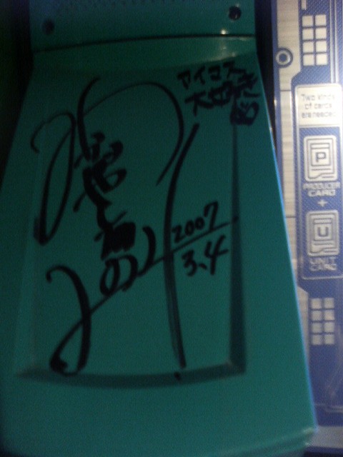 | ■3月6日:夢みたい。 3/4にライブに行ってきたと昨日更新しました、 その時に実は無理な御願いを出演者の方にしちゃったんですよ。 「ホ−ムである渋谷G-LINKに若林さんと下田さんとたかはしさんのサインだけ無いんです。是非ともサインを!!」 本当に無謀ですよね〜。勿論相手は「忘れちゃうんでファンレターでお願いね〜」と仰って下さったのですが、 昨日、いつものようにアイマスをやりに行って・・・・・・・・・ ![]() ![]() ![]() ・・・・・・若林さん、あなたは神ですか!? ライブの後に本当にいらっしゃってるよ・・・・・ まさか本当に願いが叶うなんて夢みたいです。 今日の一言:やっぱりお礼の返事をファンレターで出さないと駄目だよね。 |