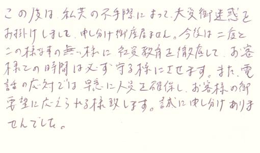 | ■3月27日:佐川急便事件勃発! という事でようやくまとめおわりました。かな〜り駄目駄目な生活事情が垣間見えてますが、 ツッコムな!! ・事件前編 3/24の夜に持っていこうと思っていた物を通販で購入。購入先から3/23に発送したよ! とメールは届いていて注文時にも3/24午前中指定で出していたので気長に。 ・3/24(土)午前5時半 起きた〜♪・・・・ちょっとちょっと・・・誰?ジジババみたいな時間に起きてなんて思った奴!! 目覚まし無くても起きちゃうんだからしょうがないじゃん・・・・・・・・ で、まず前日撮っておいたケロロ軍曹を観て〜6時から洗濯しつついつものようにTVを日本TVに あわせて「ズームインサタデー」を観る。 6時50分くらいから何気なくGCPSOを立ち上げてマルチモードで飴の移動。 7時半、TV東京に切り替えて遊戯王=>デルトラクエスト=>おはコロシアム=>おどぎ銃士赤ずきん=>ぷるるんっ!!しずくちゃん =>ふしぎ星のふたご姫Gyu!=>家庭教師ヒットマンリボーン!! と続けて見ながらPSU。うん、自堕落的だ(^^;; 全て観終わって10時半。先にヤマト急便が来てCDを代金引換で受け取る。 今回はヤマト遅かったね〜と思いつつまだ佐川が着てないことに気付く。まぁ佐川だし。 再びGCPSOを立ち上げて飴の交換(3/26秘密日記参照)。 その後再びPSUを始めて・・・・12時。まだ来ない・・・・・あれ〜?と思い問い合わせ番号で確認してみる。 11:25 不在の為持ち帰り ・・・・は?私ずっと家にいたけど???玄関に向かうも不在通知など1つもなし。 ・3/24(土)午後0時10分 何寝ぼけた事言ってるんだ?迷わず問い合わせ番号に電話。ぷるるるる・・・ぷるるるる・・・・ 誰もでねぇ・・・通話中でも無いのになんだこれ?とかけ続けて20分経過。 ぷるるるる・・・ぷるるる・・・ガチャッ!!・・・・・ツー、ツー、ツー・・・・・ うわぁ・・きりやがったよ!!なんだ?この会社・・・・ 更にかけ続けて12時35分。もう時間ねーよ!!急遽集荷専用の電話にかける。 「はい、佐川急便集荷受付センターです」 ゴルァ!!! 状況を細かく説明し、荷物は一体どうなってるのか?なんで問い合わせ専用で誰も出ないのか問い詰めました。 そこで確実に引き出した事は「早急に確認を取って連絡させます」との事。 ちなみに私はそんなに長くいられないから必ず「連絡を御願いします」と言って切りました。 12時50分・・・まだ連絡なし。しょうがない・・・・と渋谷へ移動。アイドルマスターのブースト1通と 前日選ばれたラッキープロデューサーを消化。急いで家にとって帰る。 連絡はと・・・・ん?玄関になんか紙が落ちてる。 不在通知票・・・・電話無し。 既にもう14時になってるし・・・・ってまた問い合わせ番号で誰もでねぇよ!!!! 一体どうなんってるんだよ!!!再び集荷専用に電話。 ゴルァァァァァ!!!!!!!! 状況を再び細かく説明し、荷物は一体どうなってるのか?なんで問い合わせ専用で誰も出ないのか、 なんで連絡を入れることになってるのがこんな不在票に取って代わってるのかを問い詰めました。 ちなみに14時を過ぎているので普通に再配達を頼むと16時〜18時配達になります。 ってその時間になったらいない可能性しかないじゃん!!! 電話の向こうは平謝り。とにかく17時までに持って来い!!と怒鳴りつけGCPSOへ。 連絡を入れるどころかまったく内部の統率取れて無いじゃん・・・・・・ で、3/26の秘密日記に続く訳なんですよ。 実際に持ってきたのは16時頃。担当ドライバーも平謝りでしたがはっきりいって呆れ返って 文句の言葉も出てきませんでした。 ・3/24(土)午後17時30分 楽しかったGCPSOを抜け、出かける用意をする為に軽くお風呂に入って・・・ちょびっとだけ 時間あるかな?ここが間違いの第一歩でした・・・・・・・・・ GCPSOオフラインを始めて・・・・始めて・・・・・・今起きた〜・・・20時?>馬鹿者 はい、約束の時間すっとばしました・・・・ブログで見る限りでは他の方もいらっしゃるそうだったので もう諦めて不貞寝。水月さん、本当にゴメン!!! で、翌日6時頃起きて・・・あれ?留守電が入ってる?後で聞けばいいか〜と洗濯しようとすると 玄関にこんなものが。 ![]() ![]() なんか名刺の裏にメッセージが書かれてるんですけど。しかも留守電の中身もこの人からだったらしく、 謝罪の言葉と再び謝罪に来るような事を言ってました・・・・・・・ が!・・・今日現在、再びの連絡及び訪問などは一切無し。 これが誠意ある対応ですか・・・・・・ 今日の一言:どこの通販会社も佐川やめてヤマトにしようよ〜配送料高くてもいいからさ〜。 |