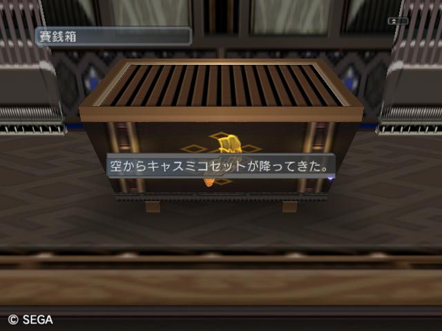 | ■11月2日:さあ困った。 昨日の配信からガーディアンズブーストロードと言う周回すればするほどドロップ率が上がるシステムが 追加されてとりあえずCを1周してきました。 コルトバ・フォワが出るのを期待して・・・・・・出ねぇorz クロスボウLV4でちんたらちんたら1ミッション10分くらいかけてやったのにこれはないよ・・・ と1周終わってやっとLV5になったんでした。相変わらずバレットは成長遅いなぁ・・・・ まあちまちま上げるのが好きなのでその内あがるでしょ。 話は変わって先日の日曜日、10/28ですね。 Go to the NEXTSTAGE!! THE IDOLM@STER GREAT PARTY @TOKYO に行って来ました。存分に楽しんできたんですが・・・・その時に歌われた曲、1曲も知らないんですが・・・・ CDは買っていたけど全部揃うまで聴かない!!なんて事をやったせいでこんなことに・・・・ ちょっと失敗。今週土曜日の大阪、日曜日の東京は残念ながらチケット無いため見れませんが、 東京の方はフラスタを見に行くつもりだったりします。まあ家からそんなに遠くないしね〜。 で話はPSUに戻って巫女さんセットのお話。 高級素材を約300個くらい放りこんで何も出なかったんですが・・・もう泣きそうになって 一昨日ヴァリスタを3丁購入、賽銭箱に投下してみたら・・・ ![]() (c)SEGA,2006.2007. やっとキター!・・・でもキャス子用?まあいいや。キャス子使ってるし。 早速装備させたのですが・・・・・カラーリングが・・・・・・ ![]() (c)SEGA,2006.2007. これはひどい。 そして今朝、倉庫に眠っていたシッガ・ワッダとか投下してみると・・・手元にはキャスミコセットが。 ・・・・どうしろと? 来月PSO服も解禁されるし早くFOmarl衣装装備したいな。 今日の一言:某trtrさんがいらっしゃればねぇ・・・ |