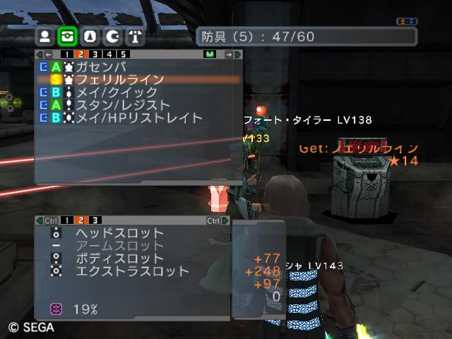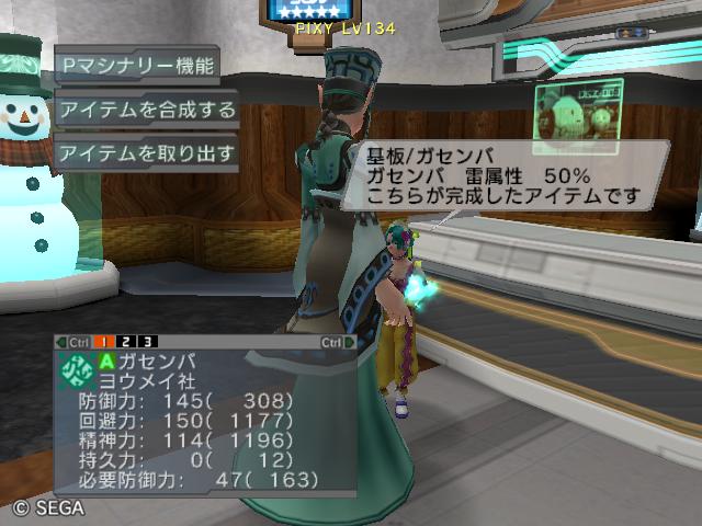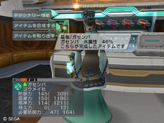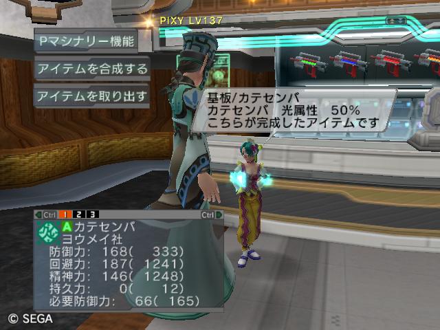 | ■6月13日:PSUってますよ? 頻度はかなり落ちてますが・・・ と言うのも他に遊んでるゲームがあるからですよ。 アイマスやって〜、ポップン16やって〜と帰るともう23時過ぎ。 お風呂入っておやすもですよ。特にポップン。猿のようにやってます。 NET対戦面白すぎ! そんな中、ちんたらとやっててまたまた大物来ましたよ。 ジャーバから初めて拾いました。 ![]() (c)SEGA,2006.2007.2008. 2個目の50%防具出来ました。 ![]() (c)SEGA,2006.2007.2008. 炎に引き続いて雷も50%が出来ました。なんか見事にパルムの為の防具ばかりって感じですね。 今40%以上無い防具は光のみなので合成しまくってるのですが、狙ったかのように36%までしか出来ない。 なんで光36%が3つも手元にあるのよ・・・・今朝も3つ合成を仕込んだのでいい加減40%以上 出来て欲しいものです。 今日の一言:GBRは29%UP。まあ後半2つ殆ど行かないんだしそんなもんでしょ。 |
