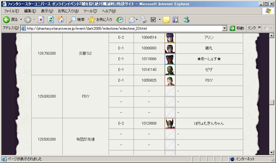 | ■7月24日:PSUイベント終了 今朝のギリギリ(7時半)まで周ってました。 とは言え昨日は23時半にはダウンしてるんですけどね。夜中に急にパチッと目が覚めて少ししたら あ、地震・・・・震度3くらいかな?長いなぁ・・・おやすも。 こんな感じ。今朝5時半に起きてTV点けたら目が点になりました。岩手で震度6強って・・・ 今回の結果としてはおかげさまでE2のキャラは大分育ちました。 3rdはLV86からLV104まで一気に成長。4thも職LV18まで伸ばせたので まあなんとか。E1は職LV10までは上げたけど・・・・ 後半はずっとマガシBを周ってたけど結局ハル/クイックは拾えませんでした。 でもBでもモトゥ・ウォルナ、カティニウム一杯だったので満足ですよ。 素材キャリガインブレイドもなんか一杯持ってるし。でもビル・デ・ビア・ホルンは1つも 出なかったよ〜。 その後のカテセンバ合成結果。光はこれで大体揃ったかも。 ![]() (c)SEGA,2006.2007.2008. ムクプロモト試しに交換。いきなり土43%ディスカ・・・ ![]() (c)SEGA,2006.2007.2008. E1でしっかりとキリ番踏んでました。 ![]() (c)SEGA,2006.2007.2008. と言う事でキリ番ゲット!行ってきました。 ![]() (c)SEGA,2006.2007.2008. ハゲから基板/ツインブーケげっちゅ♪合成することなく倉庫行きだけど。 ![]() (c)SEGA,2006.2007.2008. そんな事より聞いてよ!! PSPってほら、例の携帯ゲーム機なのに3時間電池持たない物あるじゃん。 アレにアイマスが出るという話が・・・・ あんなゲーム機買う気しないよ〜>< 確かにモンスターハンターポータブルやろうぜ!と一瞬誘われた事もあったけどさ〜。 それやってたら間違いなく今頃はモンスターハンターフロンティアでてるてるさんと遊んでそうだけど。 今日の一言:今日からはサイコウォンド合成用のディアード探しに行かないと。 |