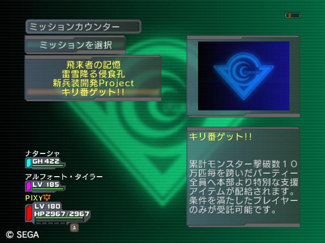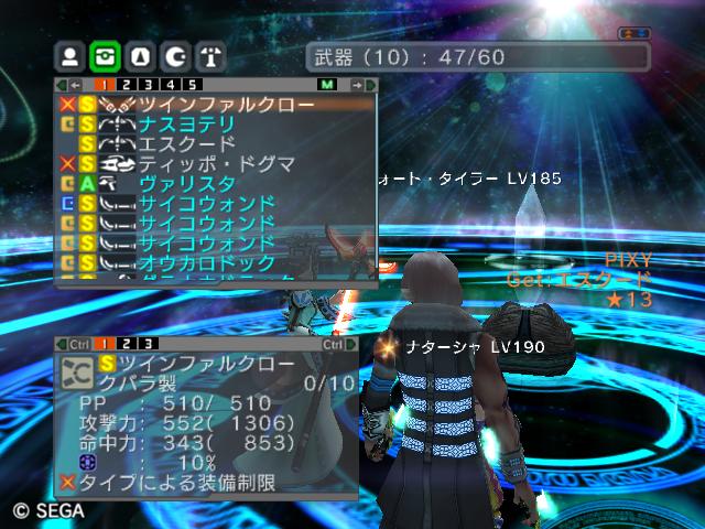 | ■1月4日:PSUの状況 イベントの真っ最中でアレですが前回は全く引けなかったキリ番を久々に引きました。 ![]() (c)SEGA,2006.2007.2008.2009.2010. ついでのツインファルクロー。 ![]() (c)SEGA,2006.2007.2008.2009.2010. でもキリ番で貰ったカクワネ・マドグ・・・wikiで見る限りでは性能はかなり微妙。 どちらにせよfTなのでSランク魔導具は装備出来ないんですけどね。 今日の一言:魔石「イリティスタ」出ない・・・なんか赤でゴリ周回やってるみたいだ。 |