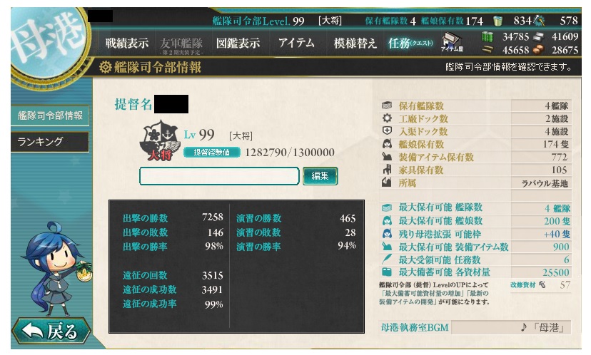 | ■4月29日:GW満喫中 出向先の休みに合わせたらカレンダー通りじゃなかったのでまさかの12連休になりました。 5/7、5/8も休んだら16連休にも出来るよ!しないけど・・・ PSO2はほぼ休息中に近いですね。 完全に緊急ゲーにされてレア掘りも出来ず、面白味もないってのがね・・・ これってEP3になってから更に顕著になったよね。SGNMァ・・・ なので必然的に艦これを集中プレイに・・・ ちなみに今こんな感じ。艦娘たくさん持ちたいのでしっかり課金してます。 ![]() 今日の一言:のんびりとE−1攻略中。 |