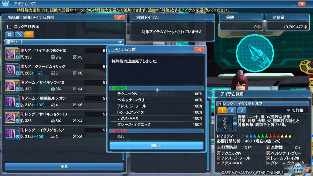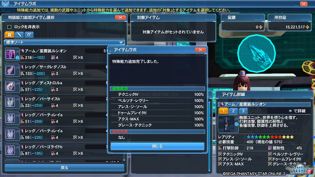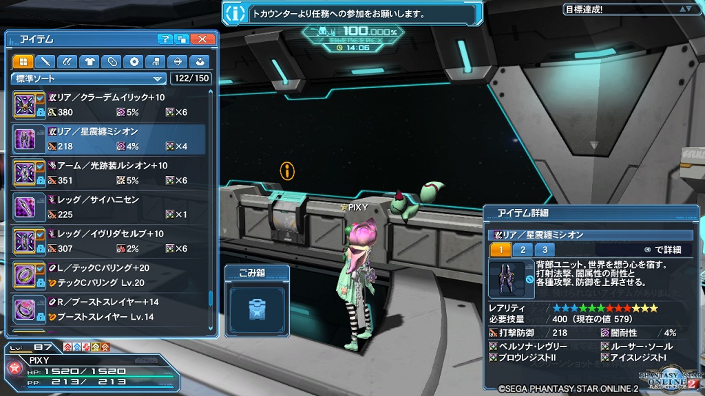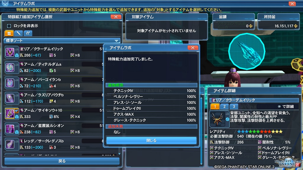 | ■1月1日:私は待っていた ☆12のユニットが揃うのを・・・ というわけでようやくまともな☆12防具の特殊能力追加にとりかかりました。 LV80解放条件の「盤石なる防具の創造主」の称号はどうしたって?ステラウォールで逃げたさ・・・・ 未だにサイキだったからねぇ・・・ そして特殊能力がまったくもってわからない。ソール3の時代以降やってないからねぇ・・・ 色々と調べて能力追加しましたよ。その完成形がこちら。 ![]() ![]() ![]() 例のユニットを1個だけ拾えてます。今エレボス43個だからあと2回で光跡に交換できるかな? で、調べてやった弊害で本来はグレース・スタミナを付けるはずが間違ってそのまま参照した サイトのグレース・テクニックのままでやってしまってHPが1280⇒980に・・・・ 今日の一言:特殊能力(法撃&PP/3)が800万で買えちゃったのがまずかった。 |