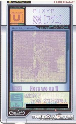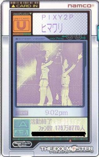 | 備考 | デュオでの初200万達成ユニット。 春香がコミュが苦手だったのですがそこは雪歩でカバー。終始安定したLVで頑張ってくれました。 元ネタがセガサターンのマリカに出てくる敵姉妹と気付く人はいるのか? |