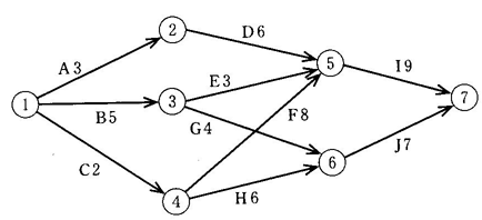 次のアローダイヤグラムに示されたプロジェクトのクリティカルパスを、 下記の解答群から選べ。ただし、英文字は作業名をあらわし、その横の数字は作業日数を示す。