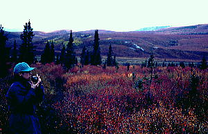 やってきたのはSavage River Campground。デナリ国立公園の入口から中に入って車で30分くらいのところ。何だかんだで16:00過ぎに昼食を食べた後、お散歩にでかける。するとレンジャーがやってきて、この付近は最近グリズリー(ヒグマ)がよく出没するので、歩くときは大声を出すようにと言われた。そう言われるとちょっと緊張する。しかし季節はもう秋。一面の紅葉が美しくい。広い広い大地。広すぎて距離感がよく分からない。
