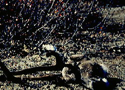お腹もいっぱいになったところで、ちょっとお散歩。見渡すかぎり紅葉した草原に、トレイルが何本か見える。そういえば、この道に入ってからは、殆ど人を見ない。たまにすれ違う車は殆どRVで、それも狩を目的としたおじさんたちばっかりであった。ほんなわけで東洋人の女性2人組(しかもかなり二人ともチビッコ)がキャンビングカーを運転しているととても不思議そうな顔で見られた。あんまり道から外れてしまうと動物と間違えられて撃たれるかもしれないので、見とおしのよいトレイルを進む。すると木の枝にカリブーの毛皮がかけてあった。ん?と思って周りを見渡すと、どうも猟をした人がそこでカリブーを解体した後らしく、頭やら足やらがその辺でバラバラと見えた。うーむ。彼等のは明らかにスポーツハンティング。狩猟民族のすること理解できない。