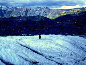 13:30出発。唄いながら風景を楽しみながら私達の移動式家屋は進む。15:00過ぎ頃、ふと気づくと私達のすぐ横にGlacierが広がっていた。おお、なんだ、なんだ?Glacier Park($6.50)というのがあったので、せっかくだからといって入ってみる。おお!ここはMatanuska Glacier。山の麓から続く氷河の上を歩く。氷が青くてきれい。気持ちよい。