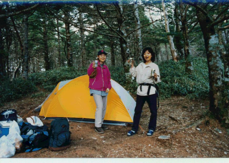 剣山の麓に向けて車は出発。途中「土釜」などの観光スポットに寄り道しつつ 15時過ぎに剣山の麓の夫婦池キャンプ地に到着。場所代は、一張り¥1000。 焚火は禁止。 とりあえず、テントを設営する。まだ設営にも慣れていないし、四国テント初夜を 迎えることもあり、ちょっとドギドキ!? 設営後さっそくビールで乾杯。うまい!