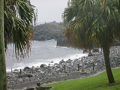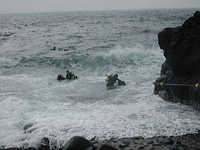 んで、本日最大の難関がエキジット。行きよりも更に海が荒れているので、タンク背負って無事に岸に辿りつけるか不安。岸に近づくともう波が巻いていて海の中は真っ白。え〜ん、コワイよぉ・・・。どんなにフィンキックしても波にガァーっと引き戻されてしまってなかなか近づけない。丘はあそこに見えるのにぃ・・・。