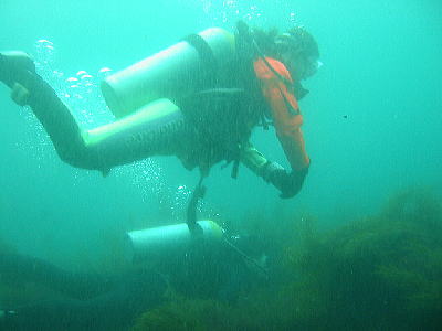 女性陣3名は久しぶりのドライスーツ。下に服を着て潜れるのでそんなに寒くはない(はず)のだが、その分沈むためにウエイト(重り)をたくさんつけなくてはならないのでかなり腰に負担がかかる。えっちらおっちら、準備して、えっちらおっちらタンク背負って海へ・・・。これってダイビングしに行くってよりも溺れに行くって感じ?