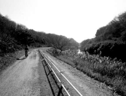 コースは途中、ちょっとしたダートあり、渓谷風の風景ありでなかなかおもしろい。走っていて殆ど人の気配のしないところもあって不思議。この木々の向こうには住宅地が広がっているはずなのに。 |