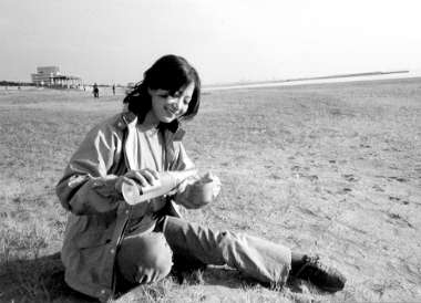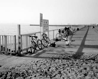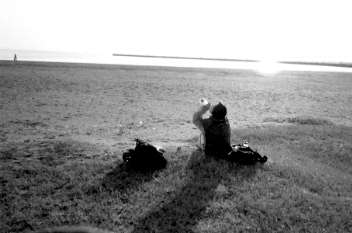 そうこうするうちにどんどん河口に近づいていく。幕張メッセのビル郡が見えると、だんだん風景も変わっていく。 何故か海が近づいてくると加速してしまう。わぁ〜海だ。東京湾。こんな海でも海は海。人工浜でも浜は浜。浜辺では家族連れやらカップルやらが遊びまわっている。 おお、お疲れさん! |