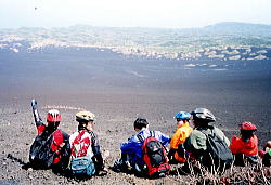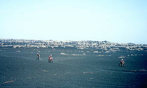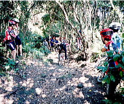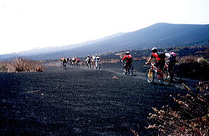 | 翌土曜日。ツアー1日目は、ここが日本かと思うような伊豆大島の裏砂漠を走る。前回と同じコースだけれど、季節が違うとまたちょっと様子が違う。すごいんです! え?何がすごいって?か、風が・・・。 Qたろう、いきなり泣きが入る。MTBをズルズル引きずって上っているのに風に後輪を持っていかれるのだ。「もうイヤだ。こんなのも〜イヤだ。」とブツブツ言いながらトボトボ最後尾についていく。 |
