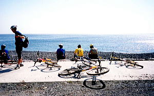 | 翌日曜日は、クラス別に3チームに分かれて海沿いのシングルトラックを快送。お天気も良くて最高であった。伊豆大島の魅力は、あのスケールの大きい裏砂漠とこの青い海の見えるシングルトラックの両方を走れることだろうなあ。あとは船と宿で繰り広げられる宴会か。宿に生ビールがあるところもすばらしいのだ! |
