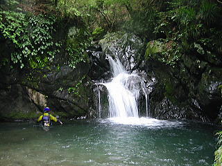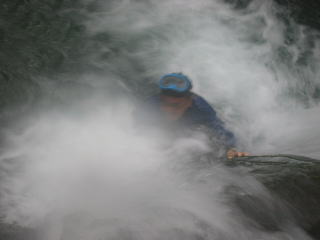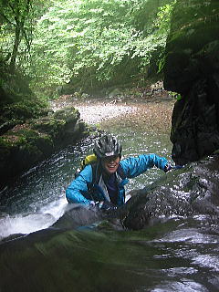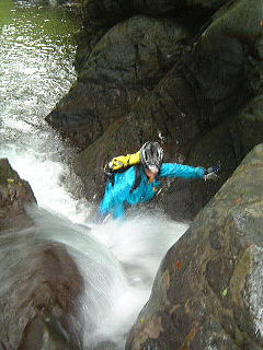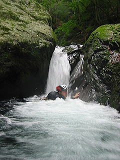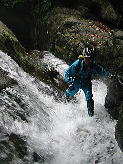 | 前晩、奥多摩方面に沢登に向かう丹羽氏をキャッチ。私も連れていけとばかりに土曜日の早朝、奥多摩へ向かって出発した。今までさんざん、「夏といえばシャワークライミングだよ」とえらそうに言っていた丹羽氏に、連れていくのはトーゼンでしょうと多少の恩を売っているQたろう、強きで臨む。 今回は丹羽氏の後輩のM氏も同行。沢登り初心者がもう一人いるので安心。丹羽氏の説明によるとガイドブック上、このコースは初心者向けの3時間コース。余裕があったら午後もう1本行くからとのこと。沢登は初めてだけれど、Qたろうだって伊達にオサルといわれてきたわけではない。山登りでも岩場の方が得意なのだ。突然だったのでろくに装備を聞いてなかったが、とりあえず水着とシュノーケリングとマスクを用意。そしたら笑われた。え?いらないの? 水着の上に速乾性のシャツとスパッツ、更に合羽を着て出発。足元は沢用の地下足袋のような靴を履いた。で、川に降りて行くと・・・アイテテ!地下足袋の裏から岩が足裏のツボを直に刺激して痛い!それでなくても足ツボマッサージなんぞに行くと飛びあがるほど痛がるQたろう、歩くたびにツボを刺激されたんではたまらない。1歩進む毎にアイテテと腰を折りながら進む。このときすでに涙目。他の二人は沢用のシューズをはいている。君らにはこの痛み、分からんでしょう。 できるだけ足裏のツボを刺激しないコースを選びつつ、沢沿を登っていく。なんだかんだいってM氏も体力あるからどんどん進んで行く。え〜ん、おいていかないでよぉ〜。そのうち川の横は崖になって道はなくなり・・・前方でドボンという音。え?何?と思うと二人とも川に飛びこんで泳いで進んでいる。うっそぉ〜。まず服を着たまま水に飛び込むのって抵抗がある。服を着たまま濡れるのって抵抗ある。でも仕方ないので後に続く。ドボン。水、冷たいよぉ!二人は目の前の小さな滝を登っていく。私も後に続くけどうまく岩場にとりつけない。Qたろう、かなり必死の形相。こんなに必死になったことっていまだかつてあるだろうか???ってな具合。師匠丹羽氏に上からロープをたらしてもらってなんとか辿りつく。 ← ドボンのM氏 |