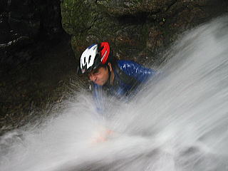 一回濡れてしまえば開き直るのが人間というもの(?)、もう気にせずガシガシ水の中に飛び込む・・・がやはり登れないものは登れない。沢登ってコースの選択なんかに結構頭を使うのではないだろうか。岩にとりついたのはいいけれど、もう上にも下にも行けないというピンチ。いくら下が水とはいっても落ちるのイヤだ〜!いつもは態度のでかいQたろうも、すっかりしょぼくれる。ロープ降ろそうかと上から見下ろす余裕の丹羽氏にしぶしぶ助けを求める。くやしいが仕方ない。 結局コースを最後まで踏破できずにQたろう途中でリタイア。沢登りってかなり刺激的で、クリアしたときの征服感はありそう。が、今回は負けた。でも終わってしまえば楽しかった。ドキドキワクワク。くやしいのでもう1回チャレンチしてみたい。喉元すぎれば・・・ってヤツだね。 |