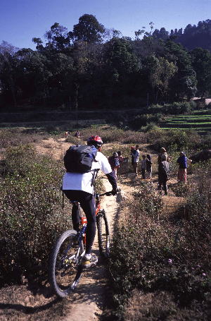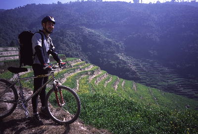 ![]() 2002/1/8 6:00起床 お天気がよければヒマラヤの日の出を撮影するといっていた丹羽氏に起こされて外に出る。ぼぉ〜。シルエットだけだというので化粧もせず、とりあえず見晴らしのいいところまで行って撮影。すごい、ここ。昨日の夕方は雲がかかっていて分からなかったが、180度ドーンとヒマラヤの大パノラマだ。日が昇るのを待つ。空の色が濃いブルーから淡いピンクに変わってきてきれい。山に朝日があたって光りはじめた。さすがにエベレストは遠くてどれか分からなかったが、こういう景色を眺めていると何だかとっても神々しい気持ちになってくる。1時間以上、あれこれと写真を撮ってホテルに戻るとウックスが食堂で待っていた。おいしい朝食をいただく。なんだかとってもリッチな気分で幸せ。 9:30出発 昨日の上り〜に対して本日はひたすら下り!。殆ど車も通ることのないオフロードをガシガシ下る。砂利道なのでちょっと緊張。途中、ウックスが昔働いていたというチベット系のホテル"Bagarkot Farmhouse Resort (www.hotelvajra.com)"に立ち寄ってお茶を頂く。昨日泊まったここのホテルもよかったけれど、部屋を見せてもらうとここもかなりいい。眺めもよいし広々していてとっても落ち着くのだ。次回ネパールに来たときは絶対に泊まりたいと思う。 ![]() 下っていくうちに風景は、ヒマラヤの見えるパノラマから、段々畑の田園風景へと変わっていく。途中、何度か撮影の為に立ち止まっていると、村の人たちがわらわら集まってきておかしい。走っていると子供達が横を一生懸命に伴走するし、とにかくもう”ナマステ〜”なのだ。声を張り上げながら走るのが楽しい。もう頬が緩み放しで、顔がふにゃふにゃになって困る。こんなにMTBがドキドキワクワクするものだとは思わなかった。 14:00 途中、コーラを飲んで一息ついた後、タメル地区のオフィスへ向かう。街へ戻ってからの道もも市場の間を擦りぬけたりして、なかなか楽しい。ツアー代に本日の昼食も含まれているからというので、ウックスと3人でスプリングロールとモモとビールで乾杯!日が高いうちに飲むビールはやっぱりうまいのだ!幸せ! ![]() ![]() 2002/1/9 MTBツアーは2日間で終わったのだが、カトマンズ市内のシングルトラックを走らないかとDawn till Dusk のオーナーが誘ってくれたので行くことにした。本日一緒に走ってくれるのはバス君。長身でかなりハンサム。あまりに端整な顔立ちなので、最初ネパール人ではなくてちょっと日焼けした欧米人だと思っていた。ところがどっこい、生粋のネパール人らしい。まだ23才の彼、奥さんはドイツ人だそうだ。うん、モテそうだよなあ。 昨日のナガルコットへのロングライドと違って、本日のコースは日本でいう里山のシングルトラック。日本のシングルトラックは、山の中の道であったり廃道であったりするのだが、こちらのシングルトラックは現役の生活道だ。「歩き」が第一の交通手段であるから当然といえば当然。昨日以上に生活臭のプンプンする道をガシガシ走る。めちゃくちゃおもしろい。道はアップダウンに富んでいるし、途中で荷物を背負ったおばちゃんやロバや馬とすれ違う。あちこちで”ナマステ〜”の声。またしても緩みっぱなしの頬。カトマンズの繁華街がすぐそこに見えるのに、ちょっと周りの山に入っただけでこんなにおもしろいなんて。道をつなげていけば、いくらでもシングルトラックは続くのだ。2時間ちょっと走っただけで、もうお腹いっぱい。こんなにおもしろい世界がすぐ近くにあるなんて知らなかった。ネパールに通い初めて10年以上の丹羽氏もカトマンズがこんなにMTBフィールドとしておもしろいところだとは思わなかったという。何だかとっても得した気分! ![]() 帰りがけにDawn till Dusk のオーナーがいるオフィスに立ち寄る。MTBのギアも売っているのだが、なかなか充実している。お茶をごちそうになりつつ、丹羽氏が雑談しているの聞いていると、どうやら共通の知合いがいろいろいるらしい。なんだか世界は狭いような気がしてきた。明日もよかったら一緒に走るか?と誘ってくれたが、今回の丹羽氏の目的はチベタンファミリーと過ごすことだったのでとりあえずお礼を言ってから、別れる。いやぁ〜楽しかった。ここのツアー会社、チベット〜カトマンズやブータン、インドへのロングライドツアーの企画もあってかなりおもしろそう。わぁ〜、どれもこれも行ってみたい!!! ニワ氏の企画する「やまみちアドベンチャー」でもネパールに行けたらいいねぇと真剣に話しつつ、幸せな3日間は終わったのだった。 |