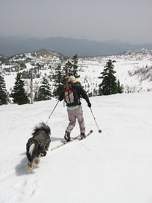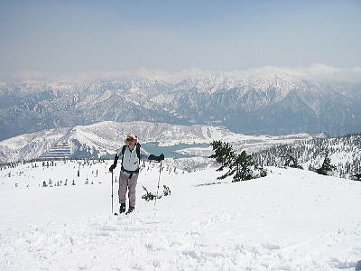 | そんなこんなで、今回もテレマークスキーの師匠と一緒。周りにテレマークなんぞやっている人がいないので、他に一緒に行ってくれる人がいない。相棒の犬君も散々誘っているのだが、さすがにこれ以上遊び道具を増やすわけにはいかないと、まるで普通の人のように保守的なお答え・・・。つまらん。一緒に始めてくれる初心者求む・・・なのだけれど。 んで、今週のQたろう、とりあえず前週にMTBでコケた傷が完治しておらず、打撲で未だにあちこち痛い。それなのに何で来てしまったかというと、ひとえに今年は雪が終わるのが早い・・・という噂から。せっかく買ったスキー、使わないともったいないではないか! 土曜日は神楽三俣のスキー場から上に上がってぐるっと回ろうというコース。このコースは行ってみて始めて気がついたけれど、去年の8月に犬君と苗場山に登ったときとほぼ同じコース!夏と冬でこんなに印象が違うものかと改めて驚いた。夏は森の中を歩いたつもりだったけれど、今は木のてっぺんを見下ろしながら歩いている。なんだか自分が急に宙に浮いてしまった気分。へぇ〜、へぇ〜と驚きながら眺めた。とりあえず動いているリフトで上の方まで上がろうという作戦。うん、楽しそう! ![]() 私たちがリフトを乗り継いで上がっていくと、一番頂上に近い最後のリフトは動き始めるのが1時間後と言われてたので、もうここから歩いて上りましょうということになる。本日は日差しが暖かいのでなんだかワクワク。リフトの終点までは歩いても1時間かからないんじゃない?という師匠の言葉を信じて、早速シールを貼り始めるが慣れないのでアタフタ。師匠に練習してこいと言われながら手伝ってもらって貼る。しょんぼり。 よし!出発である。そこの細い道をあの山に向かって進んで行けば・・・師匠の後について3歩進んだところで突然体勢を崩してよろけ、その瞬間、後ろ尻の筋を吊る。い、いたい!う、うごけん!どんどん、行ってしまう師匠・・・し、しかし弟子は尻の筋がつって動けない。ホントに足が動かないのだ。苦痛に顔を歪めるQたろうであるが、まさか師匠に向かって大声で「師匠、尻をつっってしまったので待ってください!」とは叫べない。一応、人目もあるのだ。 Qたろう、動けずに固まったまま。とりあえず、なんとか尻の筋を伸ばしてみたりする。しばらくしてやっと気づいた師匠がどしたの?と呑気に戻ってきた。なんとか動いてみるが無理をすると先週の打撲の跡があちこち痛むし、Qたろうせっかくの楽しいスキーのはずが突然満身創痍の決死の覚悟(←大袈裟)になる。「師匠、私を置いてどうぞ先に行って下さい!」「バカをいうな!オレ一人で行けるか!」と、突然美しい師弟愛。その言葉に感動して(←ホントウはプレッシャーを感じて)Qたろう、だましだましなんとか上りはじめる。やっと最終リフトの降車点についたときには1時間ほど過ぎていて、リフトが動きはじめていた・・・あーん乗ってくればよかったあ。 神楽三俣は、いわゆるバックカントリースキヤーでなくても気軽に頂上まで上がれるので、普通のスキーヤーやボーダーがサクサク歩いて頂上目指している。こちらはシールを貼った板でえっちらおっちら。あちこち痛くてかなりブルーな気分のQたろう、ひたすら足元をみつめて上っていると師匠より「後ろ見てごらんよ」のヒトコト。振り向くと・・・ |