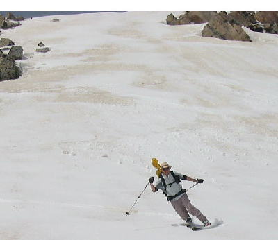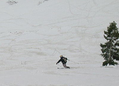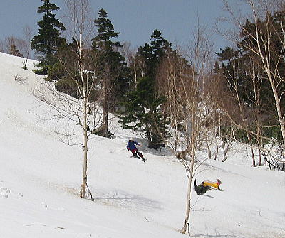 ![]() ん?師匠、ナニ背負ってるの?・・・と思ったら、おもむろに背中からギターを降ろして引きながら滑リ始めた。ナメてるなあ。 |