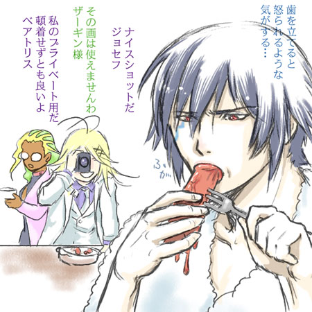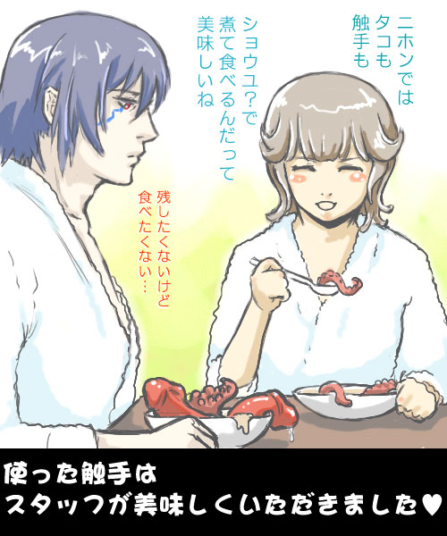 これを某所にアップした後 「触手をみてると、お醤油と味醂で甘鹹く炊いた飯蛸をあつあつご飯に乗っけて食べたくなる」 という意見が。 それを受けてその後の触手の顛末をかいてみる ↓ ↓ ![]() そして更にこのバスローブがAV撮影後のようだ(そのつもりで描きましたが・笑)となって 数人でなんやかやとネタで盛り上がり それをふたたびwaldさんがSSにして、AV撮影現場で使った触手で鍋を作るネタが発生。 ↓ ↓ 『Making of 終わりなき悪夢』該当文章に直接リンクしています。 監督:ザーギン 演出:ベアトリス 主演男優:ジョセフ 主演受優(笑):マレク カメラ:アル、ブラッド 大道具:アマンダ、ヘルマン 照明:ウォルフ、メイフォン というキャスティング(笑) みんな嬉々として触手食べてるところがシュールでした(笑) それを受けて更にもういっこネタ絵 ![]() ザーギンは運動会のお父さんのごとく、ジョセフのなにもかもを盗撮まがいにコレクションしてそうな予感。 あくまで「監督」ザーギンがですよ!(笑) それにしても、みんなの萌のチカラでここまで広がるなんてすばらしい。 そしてwaldさん、リンクさせていただきありがとうとざいます! |