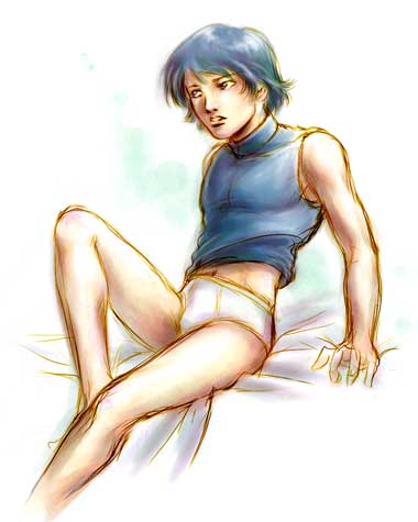初めて描いたガンダマキャラ。 さほど思い入れてなかった主人公カミ−ユ。 このズボン履かないで寝起きな彼を見た瞬間にただ可愛いな、と思ったので描いてみたのだが。 でも。 その後のこのコの行く末を思うと不憫でならない。 以下無駄語り Zのエンディングの曲、見始めた時は小賢しい(←ひどい)と思い、かわいらしいのと相まって好きではなかったのですが、 話が進んでいくうちに全体のテーマというか願いみたいなものがこめられているのではないかと思い (傷つけあう前に できる事探して/のあたりとかが)半分くらい観た時にはかなり好きな曲になっていたのに。 ラストのカミ−ユを見るともう‥‥願いはしても、実現しても壊れるほどに難しいってことか。と、とても悲しい曲に思えたり。 投げ出さないで苦しい時こそ頑張ったのにカミ−ユ‥‥とか。 アムロより割切り早くて気丈だな、と思って安心してたからあのラストにはかなりうろたえました。 そんなわけでカミ−ユのその後も気になるのでいずれZZにも突入するつもりです。 って、そんなメールを送りつけられた方もいたり(迷惑〜すみません〜〜。)と近年稀に見ぬハマりぶりです。 2.14-2002 |