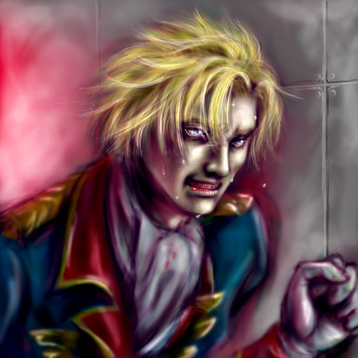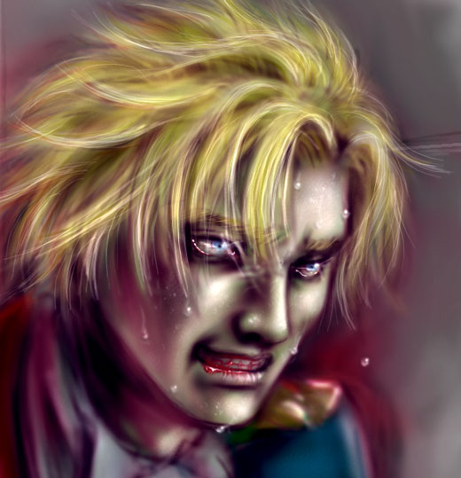 Gンダム08小隊 08小隊はとても健全な感性で描かれている。 その中で一身に病的な部分を背負う男を なぜかまっ先に描いてしまった。 ほんとに病気だから、って意味じゃなくってよ(笑)。 そんなギニアスにぃさん。 ![]() 最近人体における水滴表現ってのが気になっている。 そんでそこらへんやってみたけどちっちゃくしたら見えなくなってしまって これが案外悔しかったりしたので顔のアップとか載せてみる。→■ 08において好きなのはユーリ・ケラーネ(と、その愛人)だったりする。 それはいずれ描いてみたいけど、とにかくギニアスかいてからじゃないとちょっと納まりが悪いので先にいってみた。 喀血してふらふらになって壁にもたれてたりするギニアス。 弱れば弱る程ギラギラしていく様は痛々しい。 無慈悲な光の天女アプサラス。 いつ死ぬかわからない人生を途して、愛を「粘膜が見せる妄想」とし、協力した開発者も部下も昔なじみも妹をも、全てを排してまで造り上げる。 最期にそれを妹に「鉄の子宮」と呼ばれる。 生涯をかけて誰にも触れられない子宮を造り上げ、彼はどこに回帰したかったのだろう。 08は色々なことが対称になっていて面白い。 シローとギニアスは対称だと思うんだけど。アイナとギニアスもそうかも。 ノリスはギニアスと対照なのよね。 そしてトミノガンダムより日常的な視点に依って立っている。 それが気に入らない人もいるみたいだが(笑)私はソコが好きだ。 恋愛モノ的な結末になってしまったがゆえにアマちゃんとかいわれていて、観るまではその先入観もないわけではなかったが、観てしまったらなんてことない、トミノガンダムとは違う部分がシビアじゃないか。 普通の人間が直面するシビアさがある。 反面人間に対して突き放さない冷静な優しさもあるとも思う。 そういうトコロが感性の健全さを感じて読後感(とは言わないか)の良さがあるのかなと。 宇宙空間の設定とか戦略がどうとか、首をひねる所はたくさんあるにしたも、それを上回ってストーリーとしての視点の良さを私は愛す。 どうでもいいけどこういう文章ヘタっぴだよな(笑)。 書きたいことはあるんだけど書いてるウチになんだっけ?とかなっちゃうの。 絵だったら最初の気持が持続するんだけどなー。だからといって語る様に伝えられる絵でもないし。 まぁいいか。(トシとると努力しなくなるなー。) 2002.7.18 |