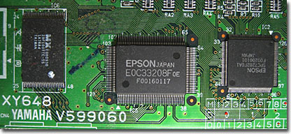 YAMAHA CRW8824IX-VK (左上、ドライブはNEC ND3520Aに換装してある)と、IEEE1394a-IDE変換基盤 (右上) 基盤のリビジョンは「XY648 YAMAHA V599060」、変換チップ(右)には「F00200101」、MPU(中央)には「F00160117」と記載されている。 EPSON製 IEEE1394a変換チップ 「SPC7282F0A」の概要