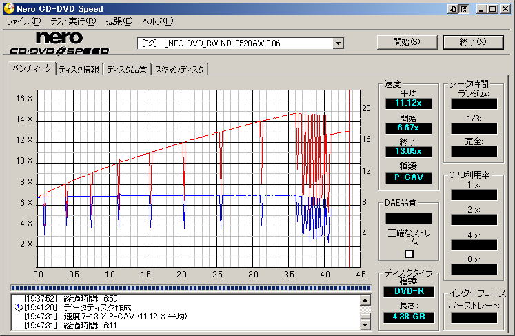 きれいに12倍速出ています。普段、8倍速以上で焼くことはまずないので、12倍速OKというのは、安心感があります。 記録速度:8x