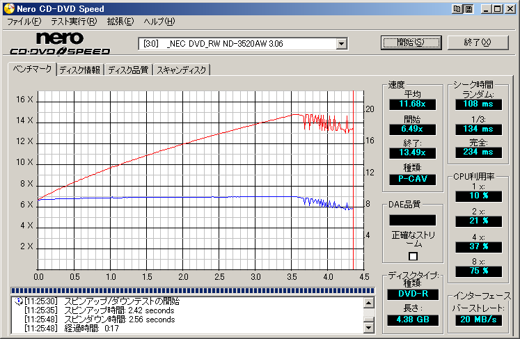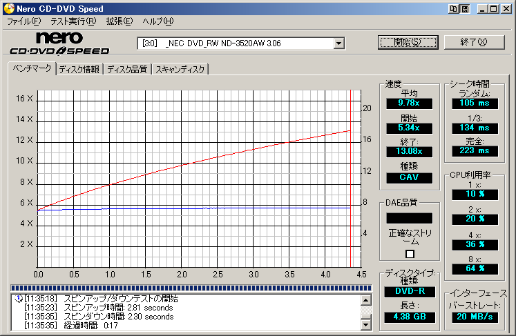 後半少しうねっていますが、問題なし。 まとめ16倍速は出ませんでしたが、予想以上の速度を出してくれました。 メモ:手持ちドライブでの動作確認状況(相性・制限等)※ NEC「ND-3520A(v3.06)」において、認識・書き込みOK。速度的には12倍速止まり。 ※ PLEXTOR「PX-712A(v1.07)」「PX-W5224A(v1.03)」は取り付けても認識せず。PLEXTORドライブは独自機能実装の弊害か、私が確認した限りでは、変換チップ・ケースとの相性が非常にシビア。おそらく他のドライブでも認識しないと思われる。 ※ PIONEER「DVR-107D(v1.20)」認識・書き込みOK。 ※ MITSUMI「CR-485GTE」は認識OKだが、書き込み時に速度が出ず不安定。(供給電力不足が原因) |