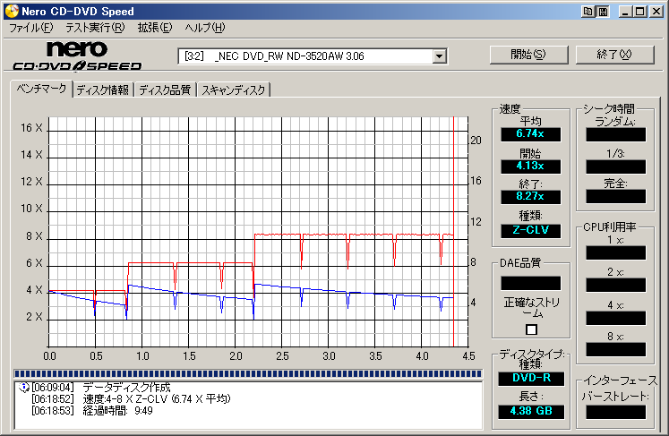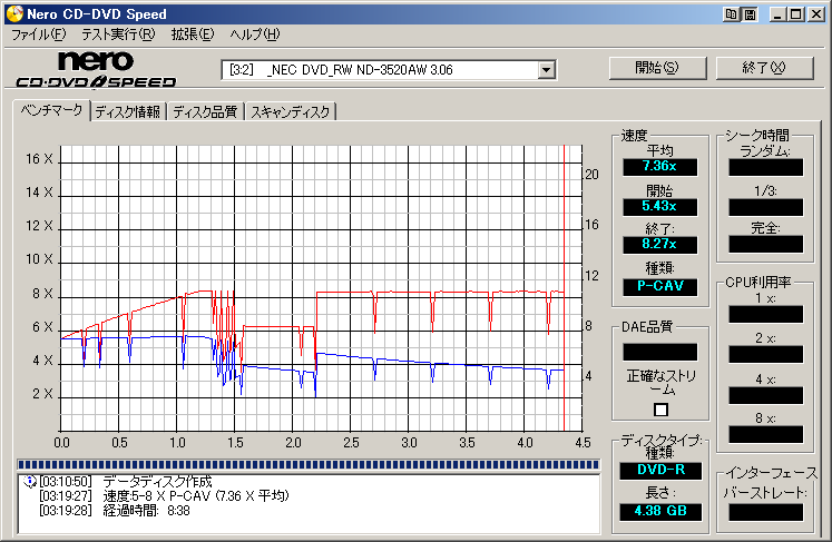 8倍速 はOKでしたが、バーストレートが11MB/sなので、ギリギリOKといったところ。 書き込みテスト記録速度:16xメディアを無駄にするだけなんで省略。 記録速度:12x