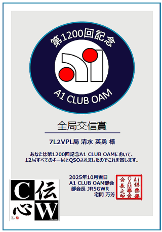 A1CLUB 第18回和文QSOパーティー参加証 2025-01-10